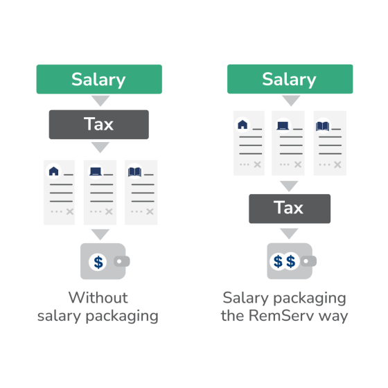 Salary packaging is a workplace benefit that allows you to pay for certain expenses before tax is taken out of your salary, rather than after. This could reduce your taxable income and potentially help you pay less tax each year.